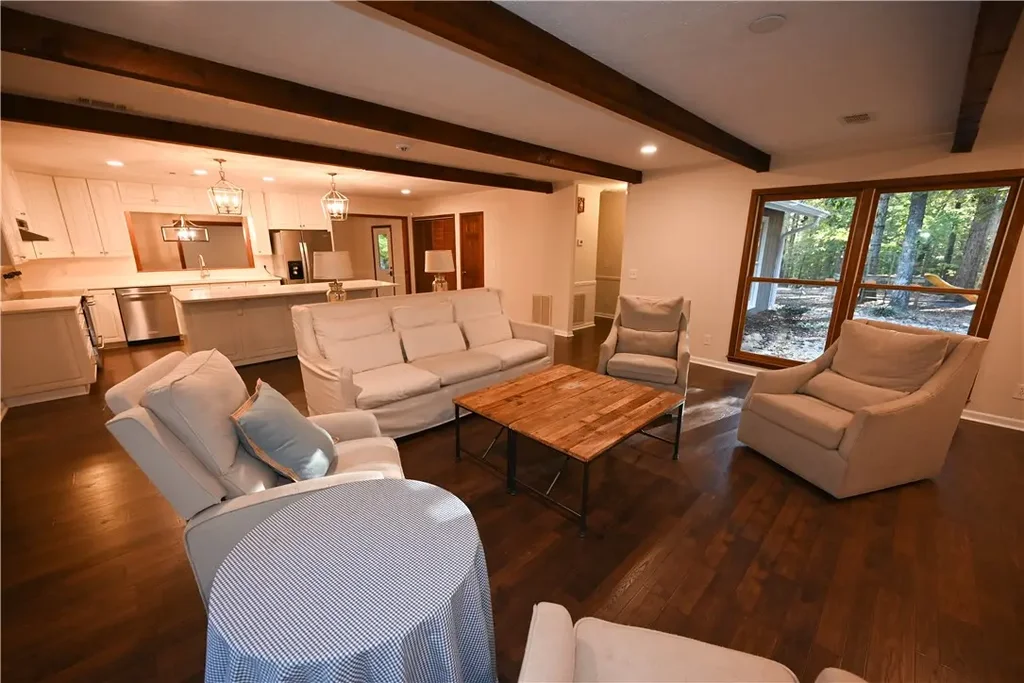 Nearly 4 wooded acres! Tucked quietly among mature hardwoods, this beautifully renovated one-level home offers the rare blend of privacy, character, & convenience—just 7 miles from Auburn University & minutes to Moores Mill dining & shopping. A long paved drive flanked by stone columns leads to a charming home surrounded by natural landscaping & Japanese maples. Inside, recent renovations enhance timeless details like exposed beams & large picture windows that flood the home with natural light. The open-concept kitchen & great room form the heart of the home, featuring custom white cabinetry, quartz counters, stainless steel appliances, & a spacious island perfect for gathering. The adjoining living area centers around a brick fireplace flanked by built-ins, creating a warm, inviting space ideal for entertaining or relaxing. The primary suite feels like a private sanctuary with double sinks, dressing table, walk-in closet, & spa-like shower with frameless glass enclosure. Two additional bedrooms & updated baths provide comfort for family or guests. Step outside to enjoy the serene patio tucked beneath colorful Japanese maples—perfect for morning coffee or evenings by a fire. The detached workshop garage adds space for hobbies, storage, or outdoor gear. With its peaceful setting, modern upgrades, & unbeatable location close to everything Auburn has to offer, this property delivers the best of both worlds: the feel of a private retreat with the convenience of in-town living.